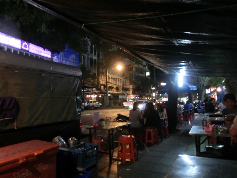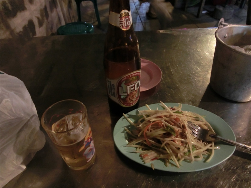 で、通りの屋台で、ビール1本とソムタム(パパイヤ・サラダ)をたのんで、時間待ち。